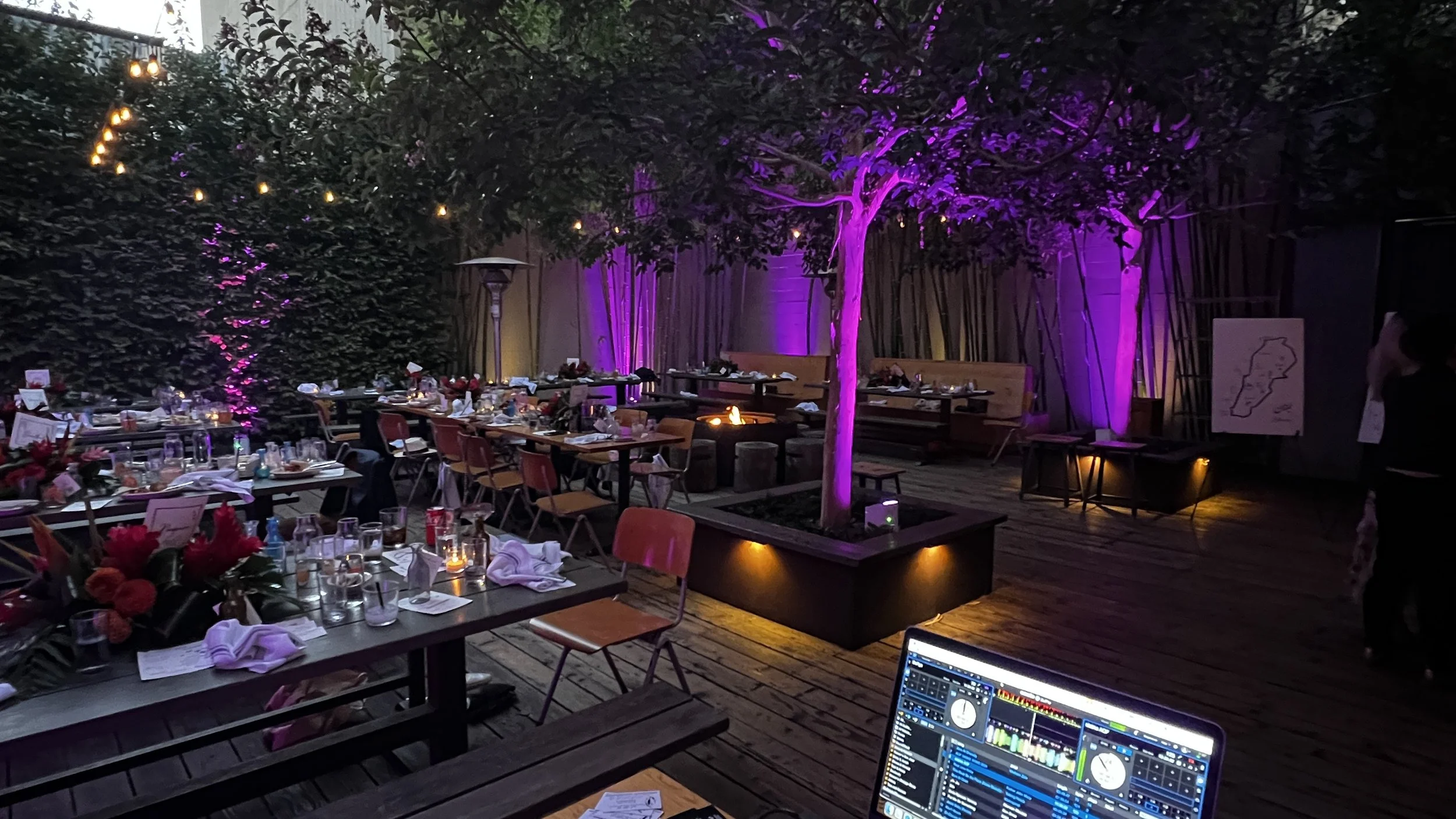 30 Customizable LED up-lighting for venue décor (can respond to the beat of the music during the dancing part of the evening)